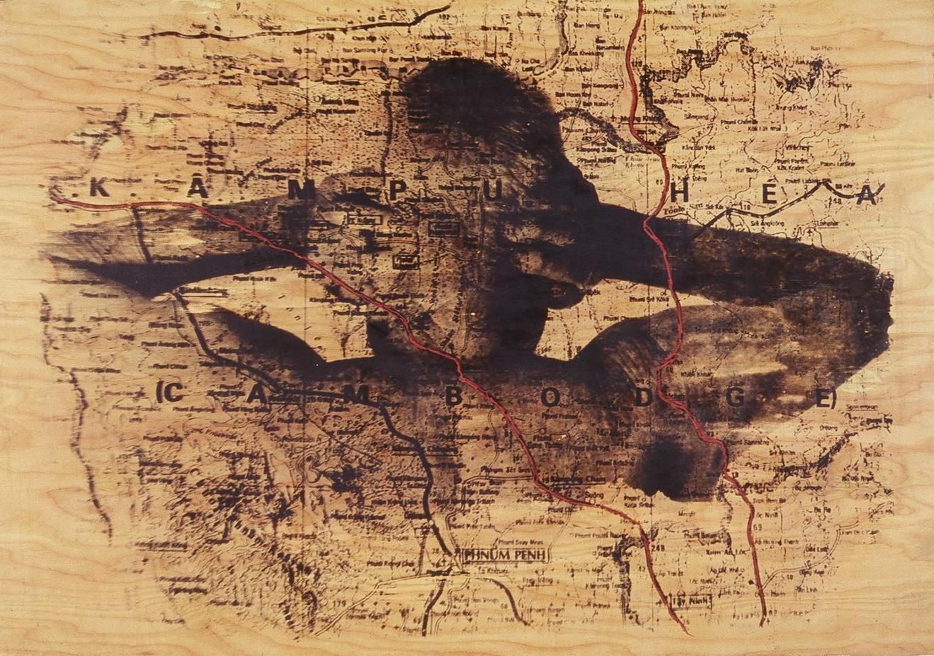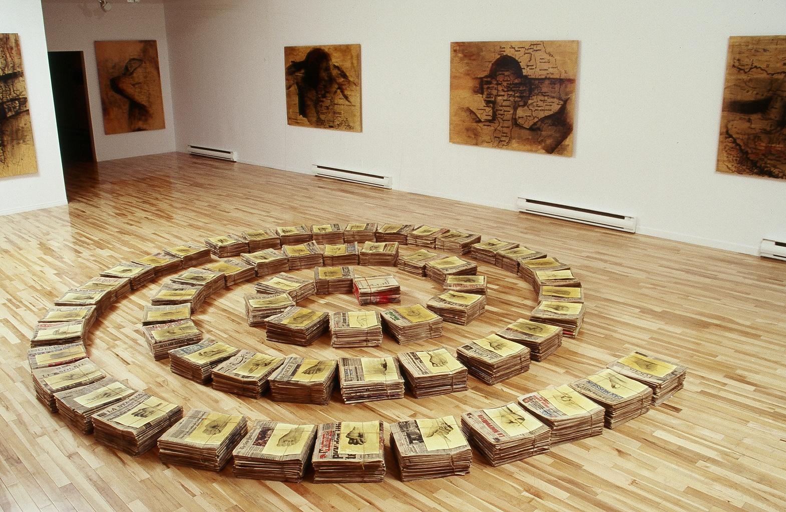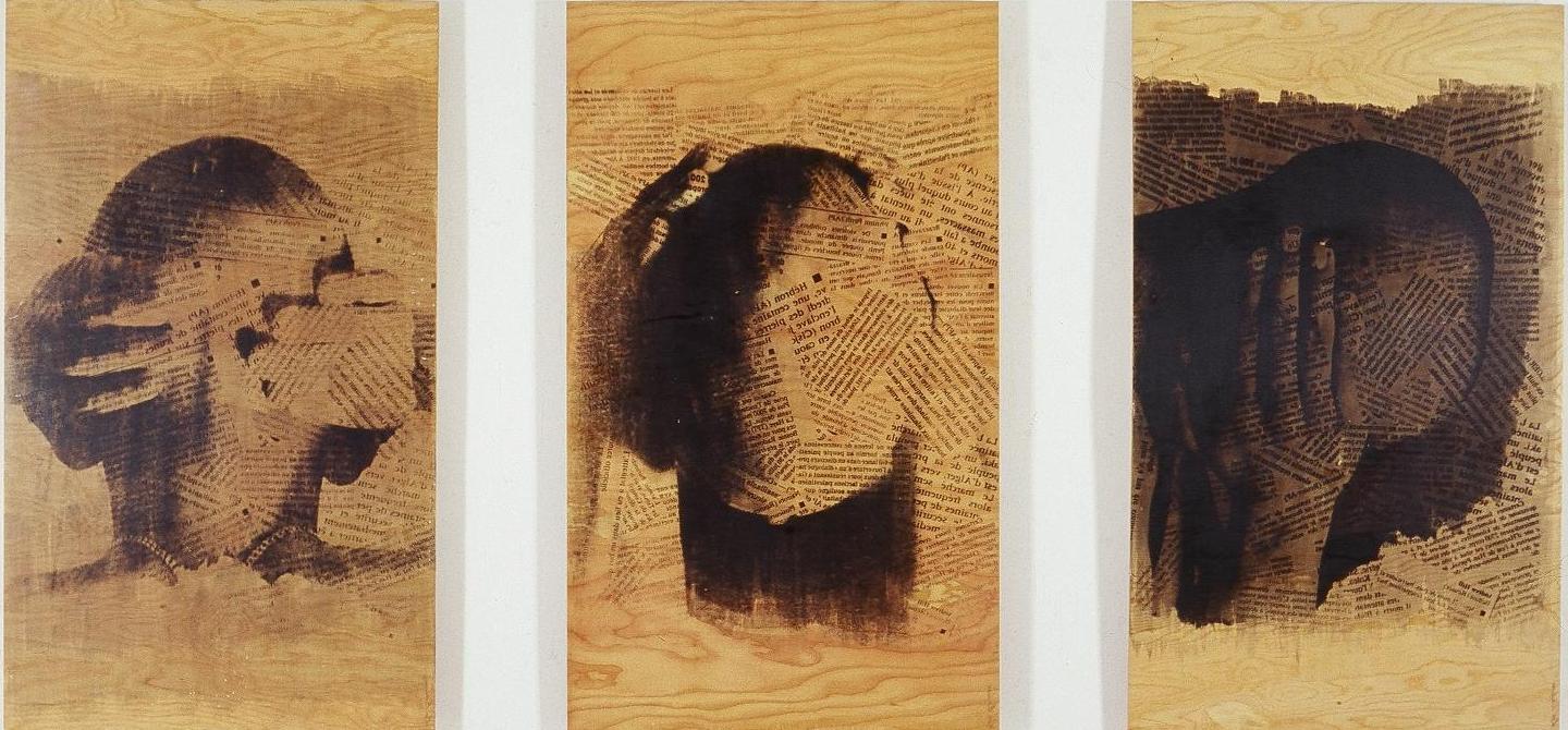 Regard posé sur les différents conflits qui bousculent la planète et auxquels on n’oppose qu’un dialogue de sourd. Photographie à l’émulsion liquide sur contreplaqué, les personnages se bouchent les oreilles sur des cartes géographiques de pays en conflits. Les piles de journaux sur lesquelles sont déposées des mains avec le langage signé qui traduit l’article 1 de la déclaration universelle des droits de l’homme. «Tous les êtres humains naissent libres et égaux en dignité et en droits». Toujours très actuel.