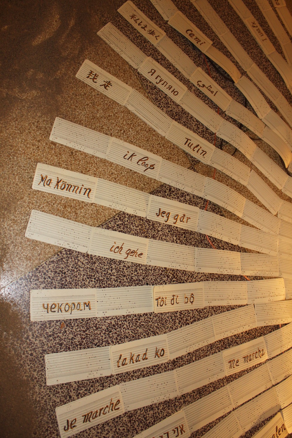 Sur chacune de ces icônes est écrit : Je Marche, en latin, en grec, en hébreu, en mandarin, langues d’origine, mais aussi en français, en anglais, en espagnol, en arabe, etc…